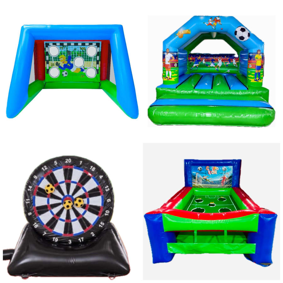 Book our bouncy castle hire Football Package in Bexleyheath, Sevenoaks, Orpington, Bromley, Beckenham, Croydon, Coulsdon, Caterham, Epsom for a safe, affordable and exciting addition to your event. This package blends Football skills with pure Football fun for ages 2–12 on the castle and on the rest of the equipment is from kids to adults and beyond.