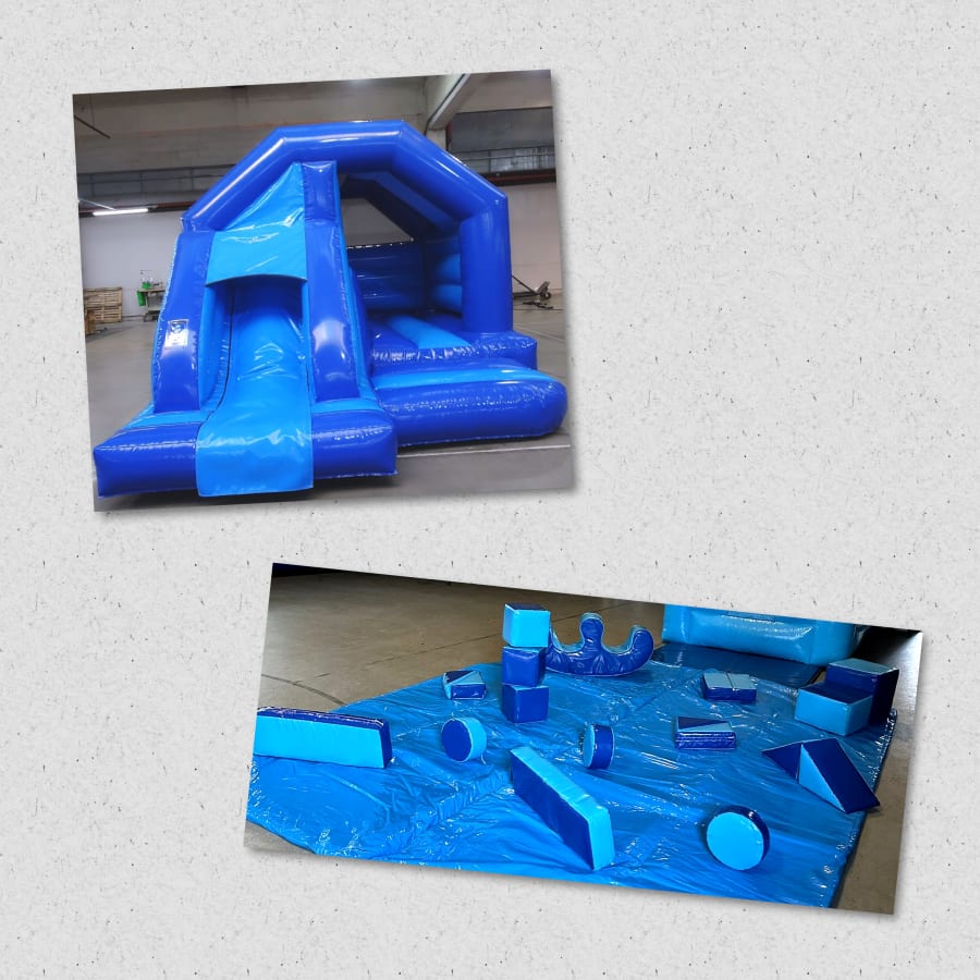 Blue/blue soft play package with a choice of colourful bounce and slide