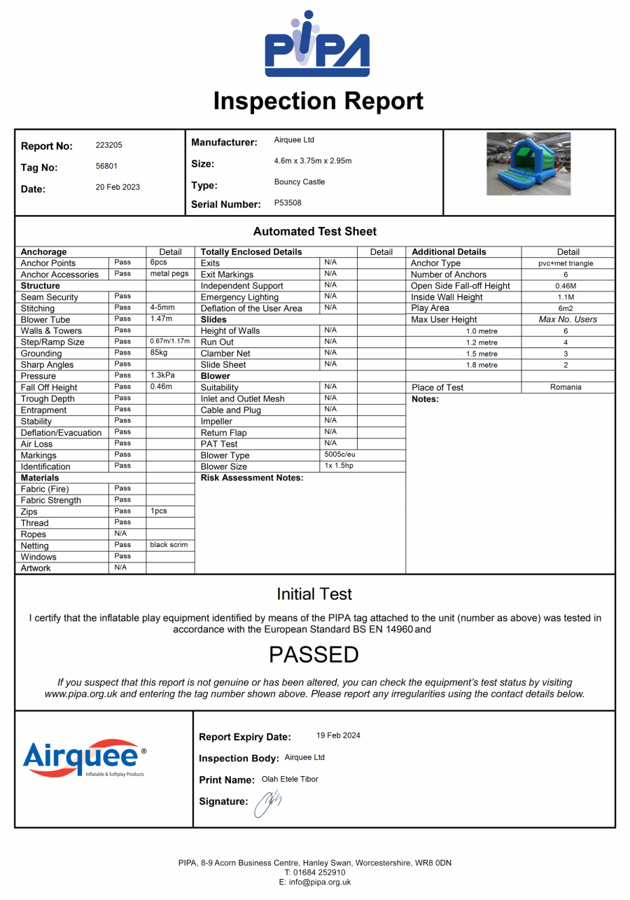 We provide an electric blower and an extension lead when setting up the equipment, the inflatable will be pegged into the grass as standard. Sand bags are provided if booked for indoors and one safety mat is supplied free.