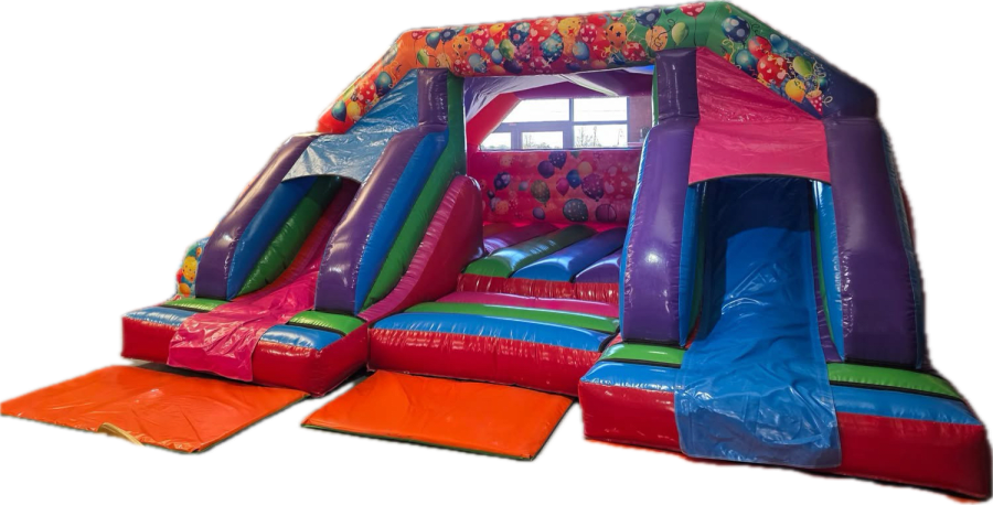 Hire the ultimate kids’ attraction. Our brand new Double Bounce & Slide Party bouncy castle delivers double the fun with a built-in twin slide and full sun and rain cover.