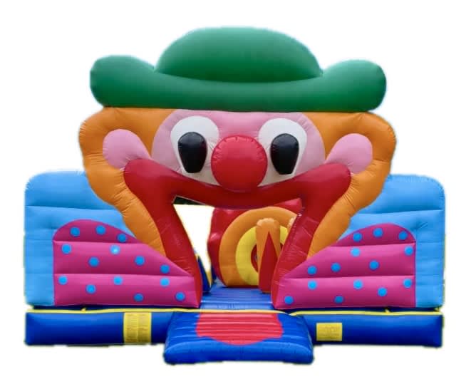 At 20ft wide, 25ft long, and 16ft high, it’s one of the biggest and boldest options in our bouncy castles collection, offering an expansive play area with colourful clown-themed artwork, inflatable obstacles, and an integrated slide.